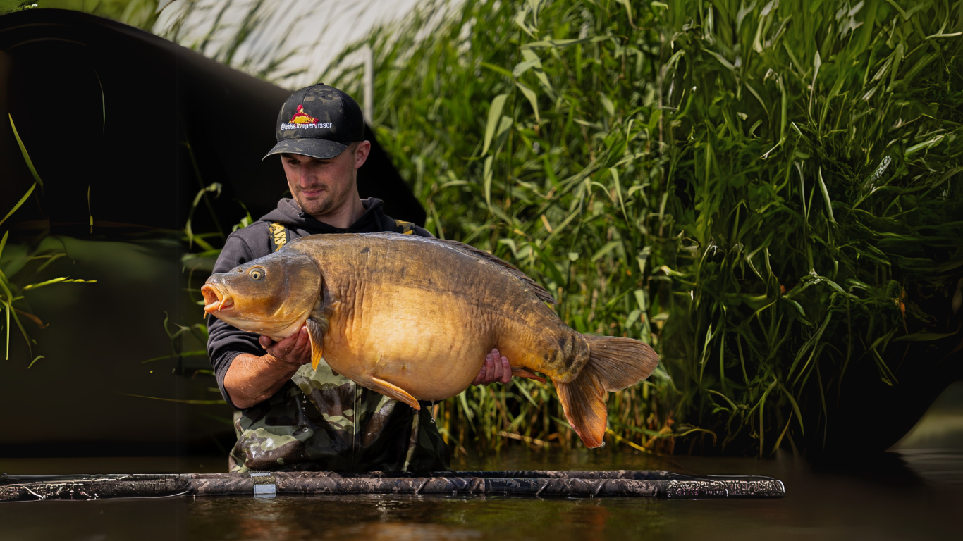 Wouter a pêché cette belle et grande carpe miroir depuis son bateau sur un spot soigneusement approvisionné deux jours à l'avance avec un mélange de Monstercrab et de Roasted Nut. Lors d'une séance avec un gros orage, il y a eu aussi de la tempête au niveau des captures. Les cannes continuaient à avancer et les carpes étaient capturées les unes après les autres.